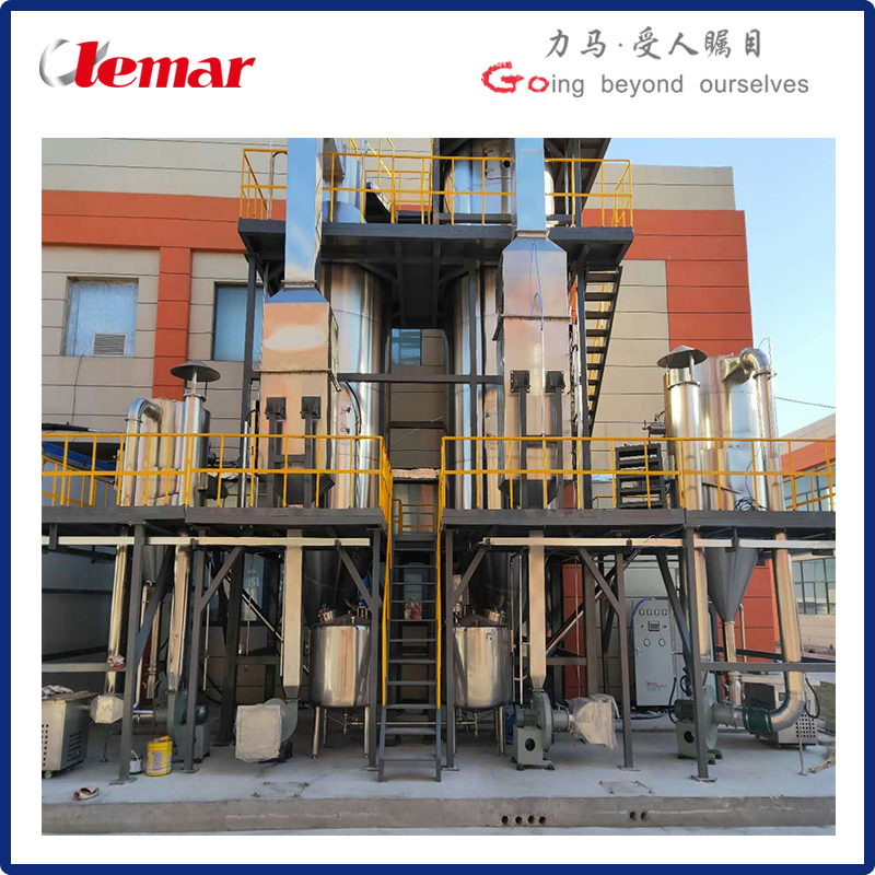 本机组为开式循环,并流式,离心式雾化,微负压操作。干燥介质空气经过初、中效空气过滤器预过滤后根据操作指令由鼓风机吸取再经亚高三效空气过滤器过滤净化达到十万级后由蒸汽加热器和电补偿器加热成所需温度的热风,然后通过热风分配器有规则地成螺旋状进入干燥主塔。液体物料根据操作指令经过螺杆泵,进入高速旋转的离心喷头,在离心力作用下被分散成小雾滴。在干燥主塔内,小雾滴与热风在充分接触,沿其特定路径进行热交换后被干燥成为产品,大部分的产品在主塔底部出料,少部分的产品随尾气一起通过旋风分离器实现分离,物料被收集,气体介质由引风机引出再经过水膜除尘器过滤后被排出。
