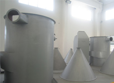 空气经过加热器被加热至~230℃左右,进入旋转闪蒸干燥机。湿料由输送装置送入螺旋加料机构,螺旋加料器可无级调速。物料经挤压后强制进入主塔,随即被高速旋转而又具有不同角度的刀片粉碎,又被高速进入旋转闪蒸干燥机主塔的高温气流冲击高速旋转、夹带上升,这时气流温度急速下降,物料水分迅速蒸发从而完成干燥过程。被干燥的物料随高速高温气流进入脉冲布袋除尘器。气流由滤袋外部进入,向上排出,为防止滤袋积料,由脉冲电磁阀定时、轮流由各滤袋上部输入高压气流(0.5~0.6Mpa),反复反冲滤袋,以达到*佳除尘效果。