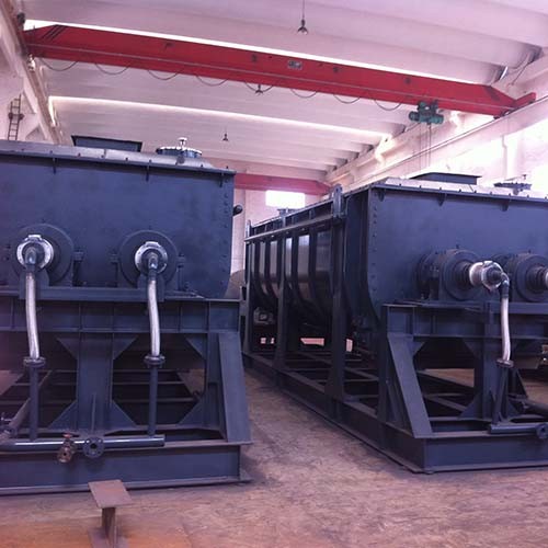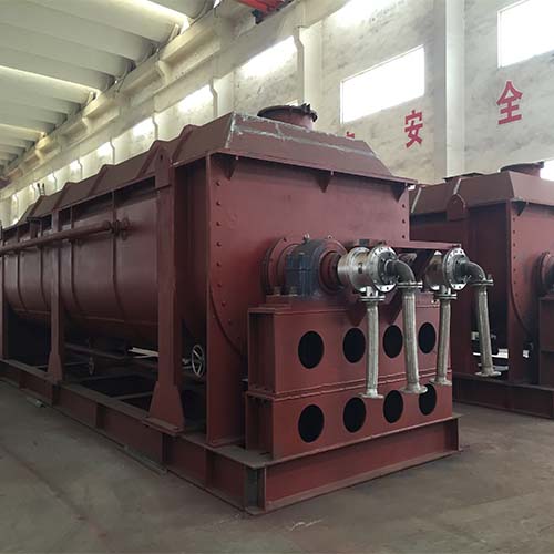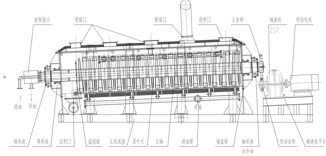 设备的核心是两根空心轴和焊在轴上的空心搅拌桨叶。桨叶形状为楔形的空心半圆形,可以通入加热介质。除了起搅拌作用外,也是设备的的传热体。桨叶的两主要传热侧面成斜面,因此当物料与斜面接触时,随着叶片的旋转,颗粒很快就从斜面滑开,使传热表面不断更新,强化了传热。在桨叶的三角形底部设有刮板,以将沉积于壳底的物料刮起,防止产生死角。