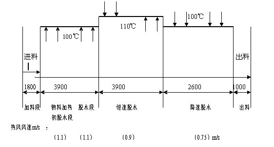 如图所示,椰蓉由摆动式布料机自动均匀进入加料段,由下向上鼓进经100℃热风,其主要作用是椰蓉比较均匀吸热起到初脱水效果,逐渐进入脱水阶段,椰蓉进入热风温度110℃干燥段改变风向由上向下进110℃热风,椰蓉在该区间应是物料的恒速脱水段,椰蓉的水分主要是在上述两个区间脱除的,已脱除约80%水分的椰蓉再输送至热风温度为100℃的再干燥区间,该区间100℃热风由上向下穿过已较干燥的椰蓉层,其主要作用是慢速脱除物料内部迁移出来的水分。经过以上主要干燥段脱水后,椰蓉的含水率可控制在≤3%的范围。已达标的椰蓉出料进入下一道加工工序。为使热风分风更均匀,设备设计成8个单元,内部设有特殊的分风装置,并对每个单元的温度进行自动控制。