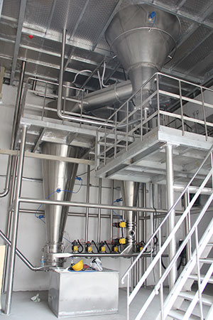 针对中药干燥工艺,本公司经过多年的生产实践优化改进部分生产设备,自主研发了中药配方颗粒专用干燥机。该设备是利用高速离心式雾化器使物料分散成雾状,与热空气充分接触完成瞬间干燥,形成粉或颗粒状成品的干燥装置。