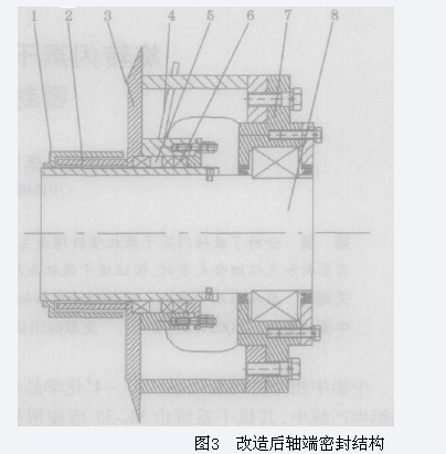 加之系统为0.045MPa正压操作,泄漏量很快变大,因此该设备在此操作工况下,进料螺旋轴端采用盘根密封结构无法满足使用要求。