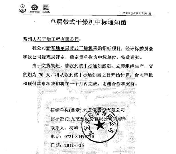 单层带式干燥机中标通知函