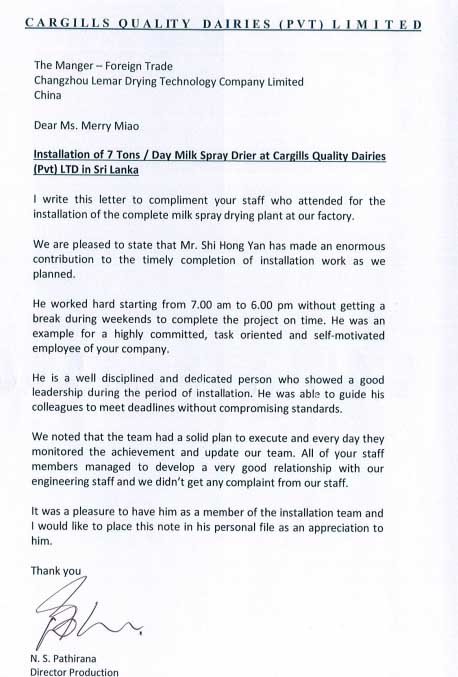 信中这样写道:“亲爱的Merry Miao女士:我写这封信主要是想要赞美一下你公司的这次参加了我们厂完整的牛奶喷雾干燥设备安装的员工。我们真的很高兴,特别是史洪雁先生,他在这次安装任务中作出了巨大的贡献,他按照我们的计划时间表提前完成了安装工作。他工作很努力,每天从早晨7点到下午6点,周末都没有休息,只为了能够按时保质保量完成项目。他代表着一个致力于任务导向和自我激励的公司。并且他是一个很有纪律的人,在领导小分队安装期间,严格要求自己,一直坚持到最后完成安装。我们还注意到,你们的团队计划非常明确,每天都在监控设备的使用情况,并对我们的人员进行现场培训。你们所有的员工与我们的工程人员都相处得非常愉快,我们没有得到任何来自我们员工的投诉。最后,我想说的是,我把史洪雁先生写在信中,只是因为单纯的欣赏这个人。”